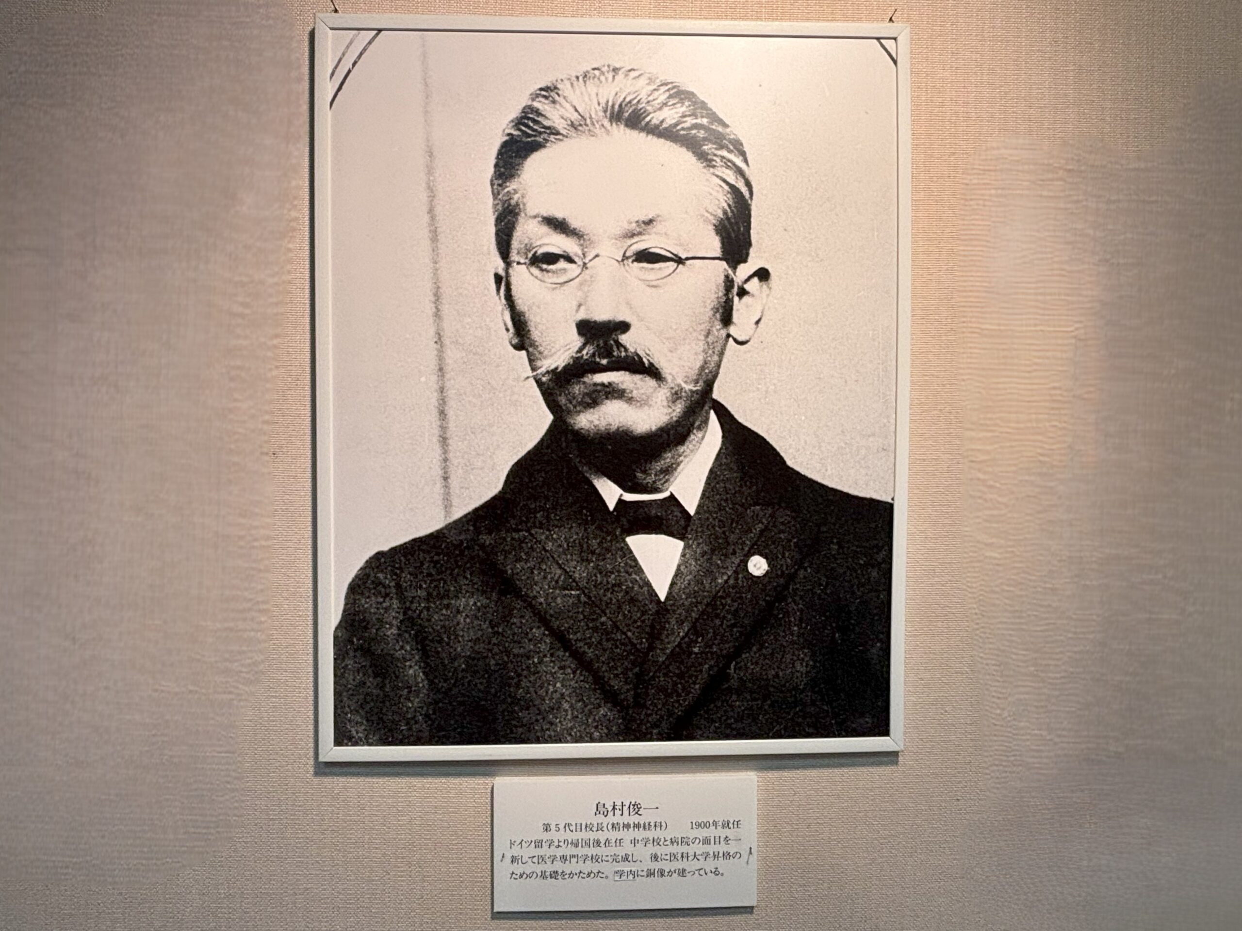 幕末の文久元年(1862年)江戸駒込(現・東京都文京区)に生まれた島村俊一。明治20年(1887年)帝国大学医科大学医学部を卒業後、大学院に進んで精神病学を学びました。医院での勤務、島根県での狐憑病(狐の霊が取り憑くといわれる精神異常)調査、ドイツ留学を経て、明治27年(1894年)京都府医学校教諭となり、精神病学・神経病学・法医学を担当、京都府立療病院医員も兼任しました。明治32年(1899年)に京都帝国大学医科大学が開校すると、京都の医学者が次々と引き抜かれました。医学校は人員不足となり、存続が危ぶまれましたが、島村は医学校・療病院に留まり、自ら医師たちを呼び寄せて危機を脱することができました。そして、翌年、医学校長に就任し、明治36年(1903年)5月には療病院長を兼務します。同年6月、医学校は京都府立医学専門学校として認可され、療病院は同校附属病院となりました。これらの功績、そして神経精神科教育と治療への貢献を讃え、学内には島村の銅像が建立されています。